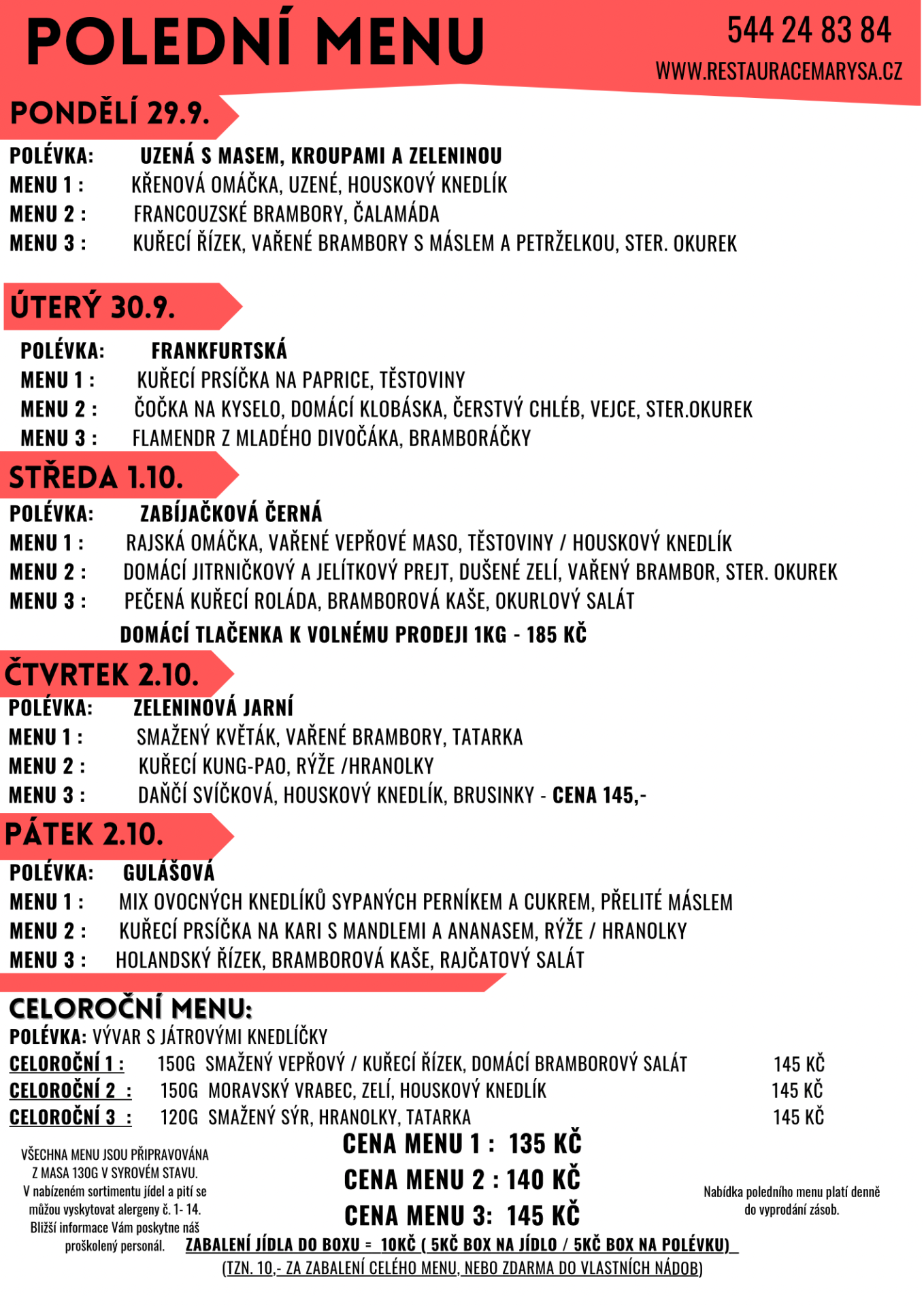 MENU K DOVOZU JE NUTNÉ OBJEDNAT SI NEJPOZDĚJI DO 10:00 V DANÝ DEN NA TEL.: