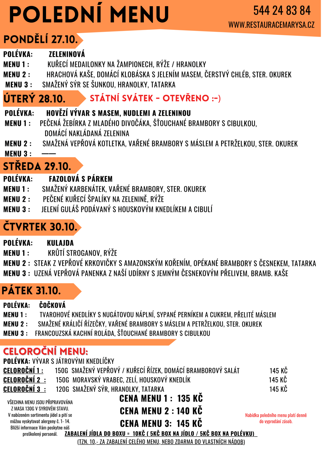 - V nabízeném sortimentu jídel a pití se můžou vyskytovat alergeny č. 1- 14. Bližší informace Vám poskytne náš proškolený personál.